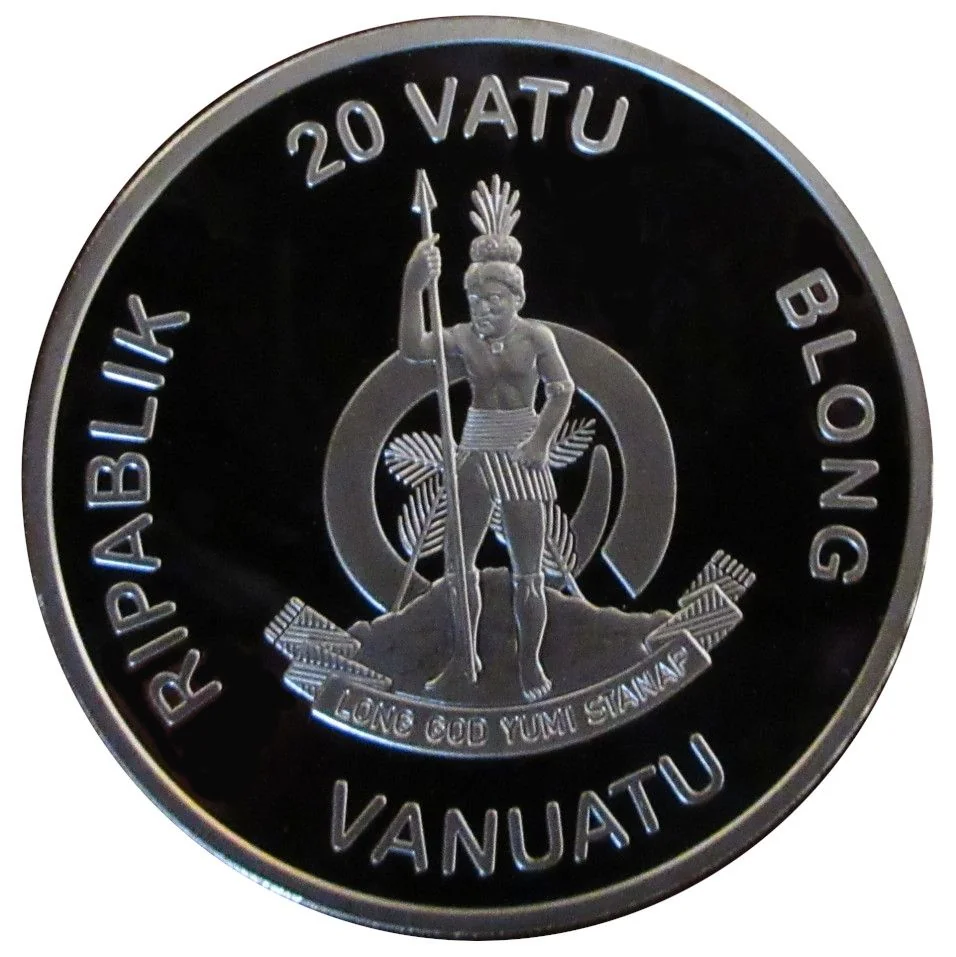 A Melanesian warrior before a curved boar's tooth, a scroll reading "LONG GOD YUMI STANAP," and the value.