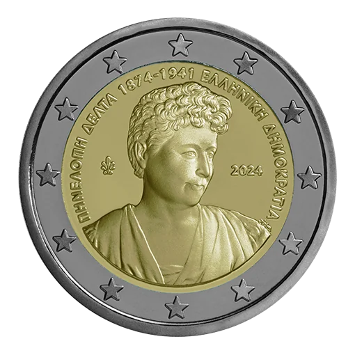 This coin honors Penelope Delta, a pioneer of Greek children's literature. Her portrait is bordered by her name and dates, "HELLENIC REPUBLIC," a palmette mintmark, and the minting year. The outer ring features the 12 stars of the European flag.