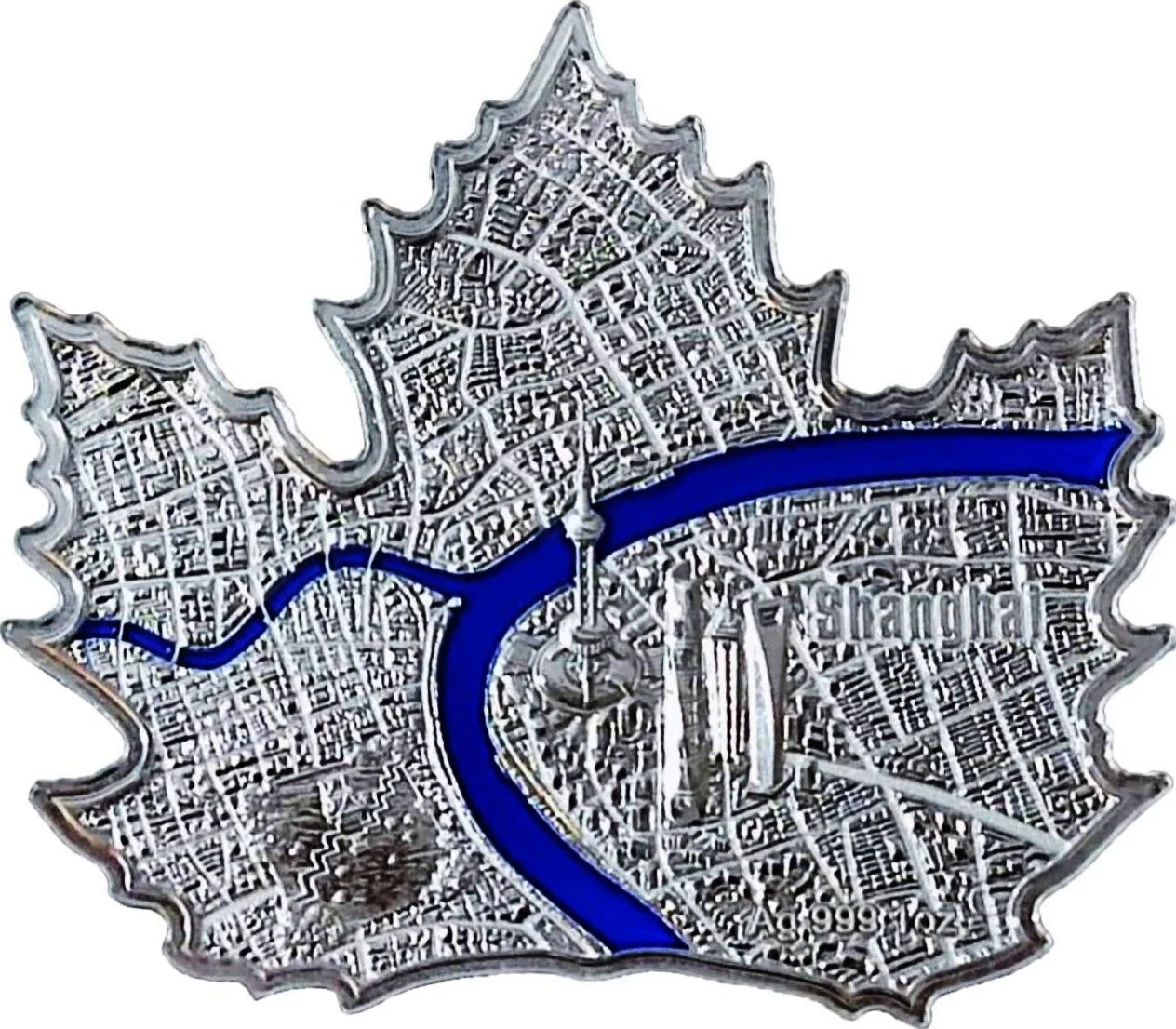 Panoramic Shanghai view with the Huangpu River and Suzhou Creek in blue enamel.