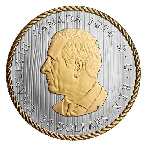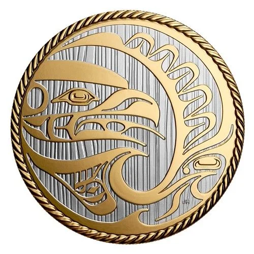 Inspired by a carved wood panel, this coin's reverse depicts an Eagle hunting above an Orca's dorsal fin in Northwest Coast formline style. To evoke a Kwakiutl panel framed by cedar rope, both sides feature a wood grain texture and a rope border.