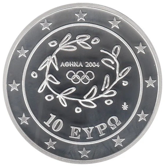 The design features the Athens 2004 emblem: a kotinos (olive wreath) encircling the Olympic rings, all enclosed within a ring of 12 stars.