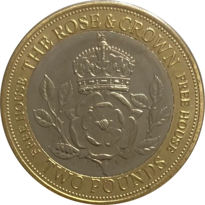 The Rose and Crown pub logo encircled by legend, name below.