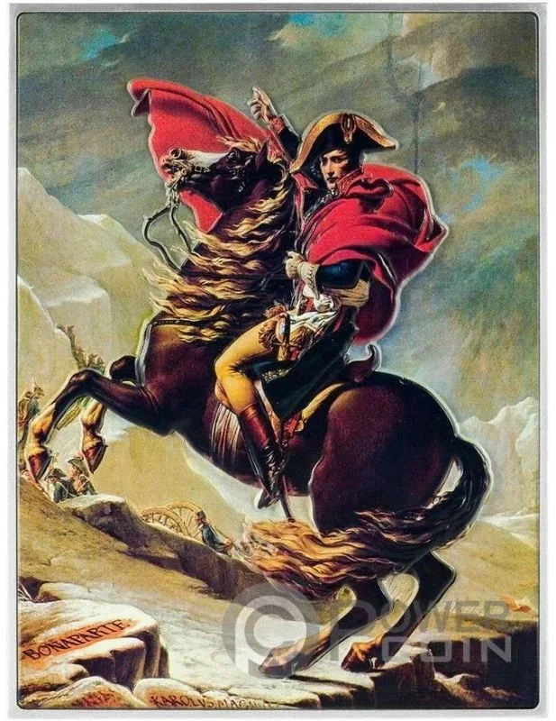 Napoleon is depicted during the crossing of the Alpine pass of the Great St. Bernard by the Reserve Army, an episode that marks the beginning of the second Italian campaign.