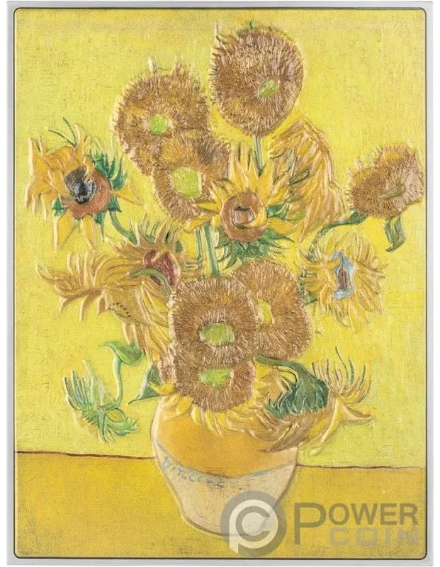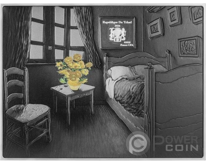 Van Gogh-style interior with sunflowers on a table and the Coat of Arms of Chad on a bed.