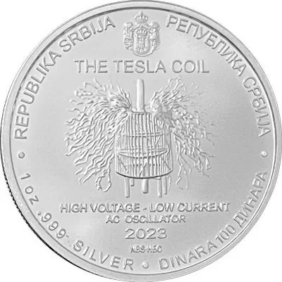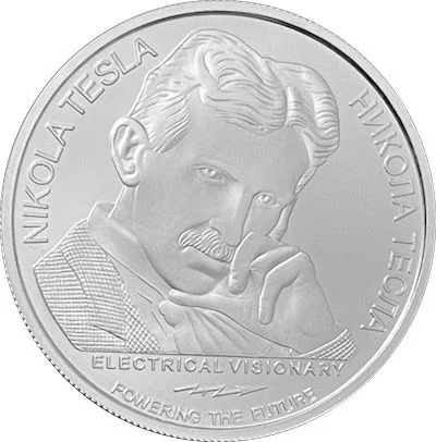 Image of Nikola Tesla, hand to face, encircled by his name in English and Serbian Cyrillic.