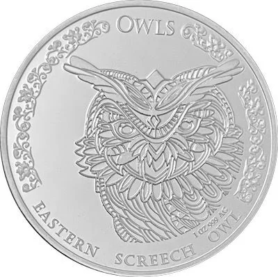 Eastern screech owl profile, surrounded by coin-edge graphics.