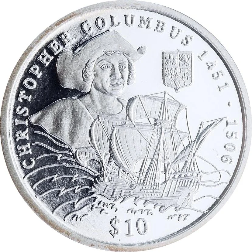 Foreground: a sailing ship. Background: Columbus's portrait left, his family's coat of arms right.
