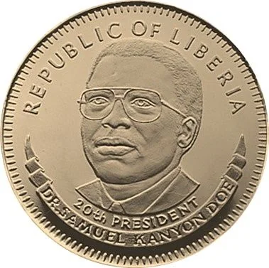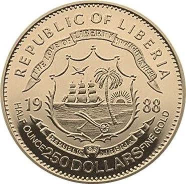 Liberia's coat of arms separates the date, denomination, and fineness.