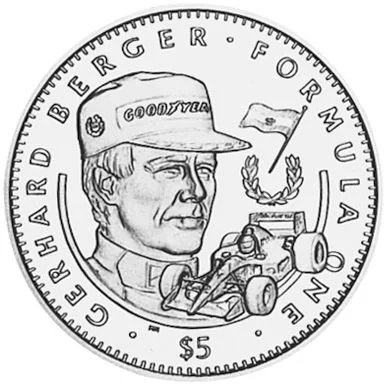 Gerhard Berger wearing a hat, beside a racing car and flag.
