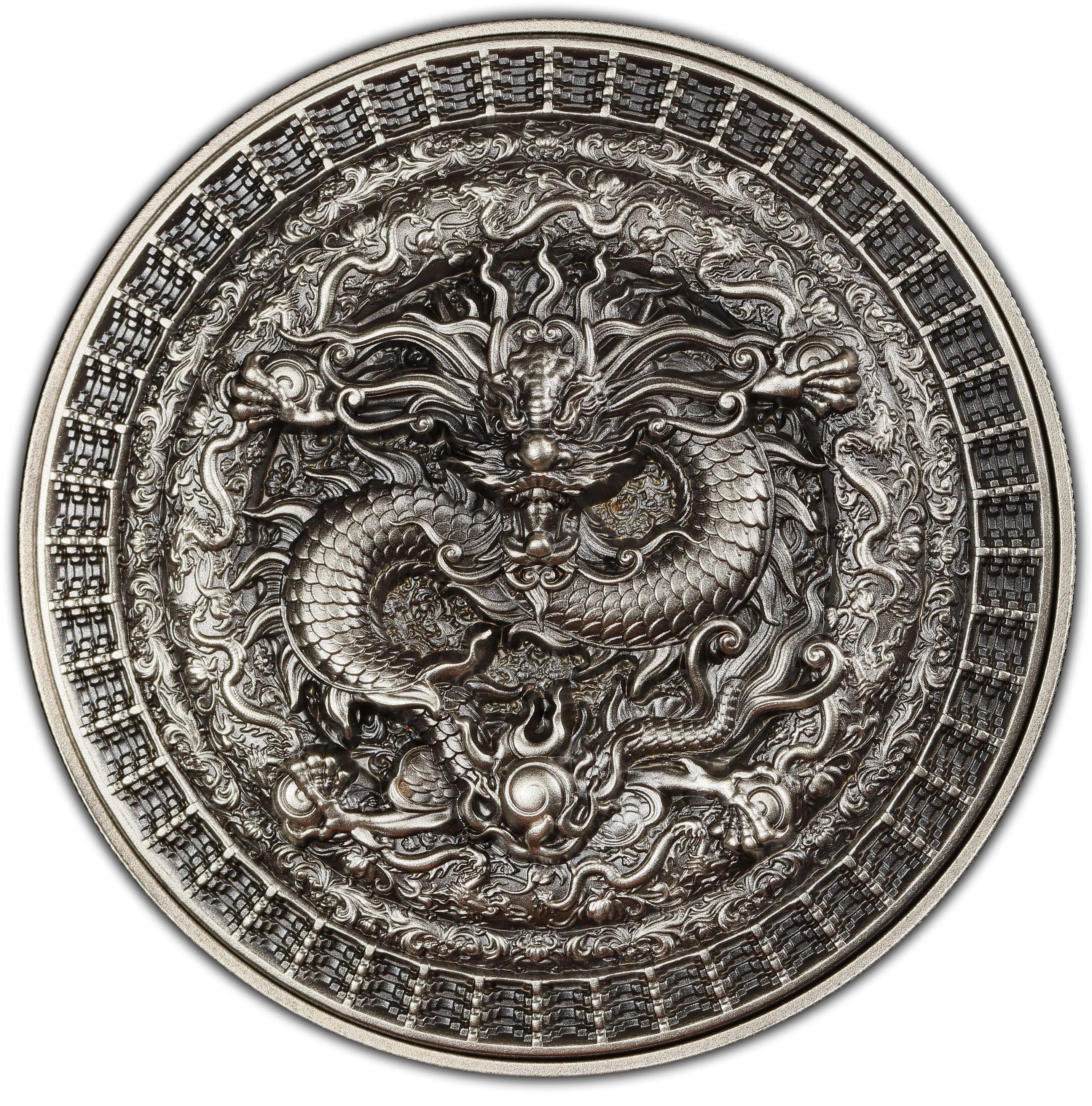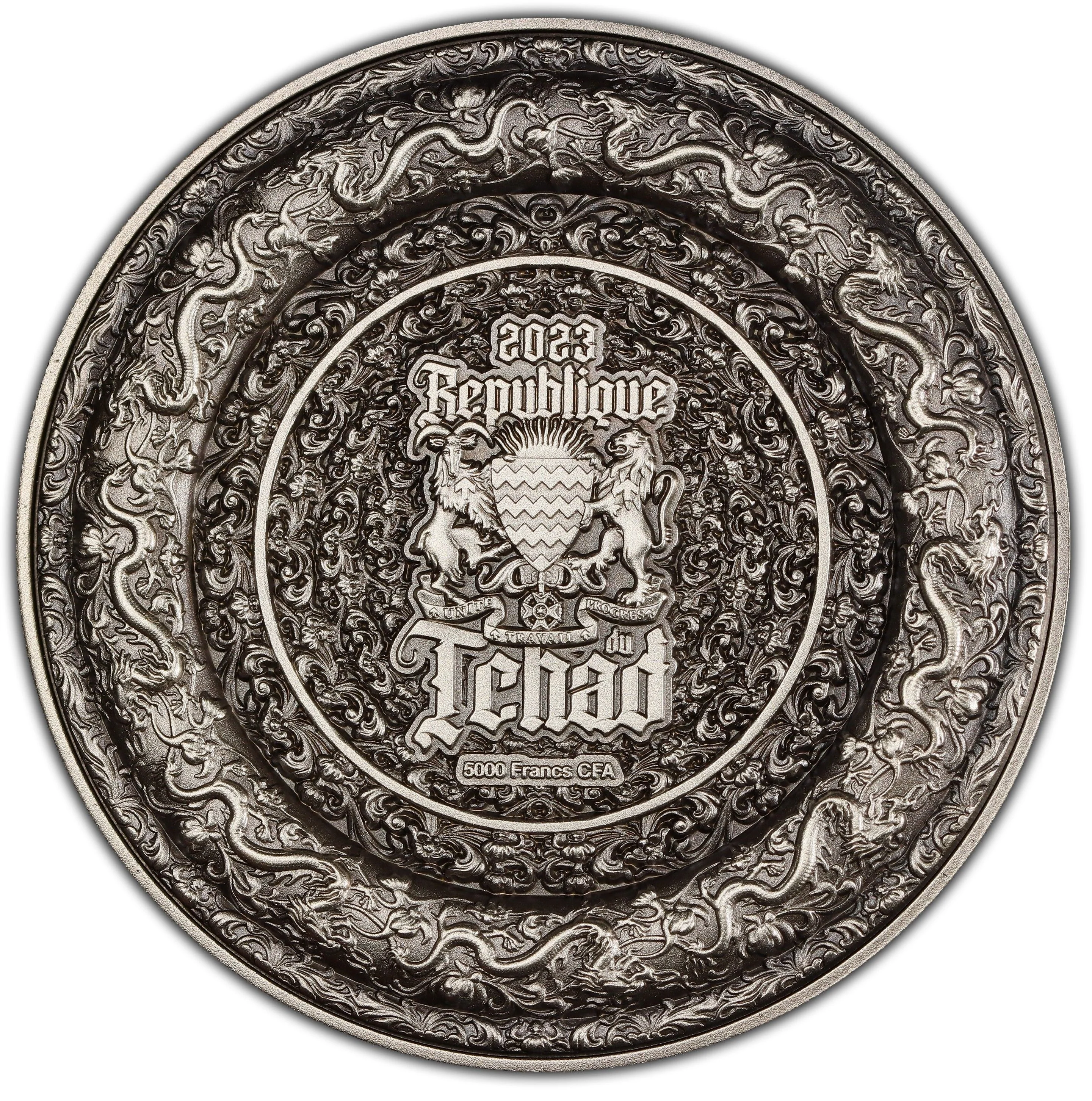 Coat of Arms of Chad surrounded by nine Chinese dragons.