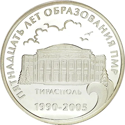 The Republican Drama Theatre building features a circular inscription: "ПЯТНАДЦАТЬ ЛЕТ ОБРАЗОВАНИЯ ПМР" (Fifteen Years of Formation PMR), with "ТИРАСПОЛЬ" (Tiraspol) below and "1990-2005" at the bottom.