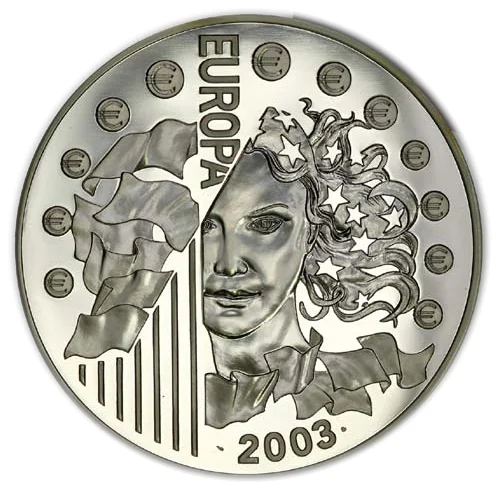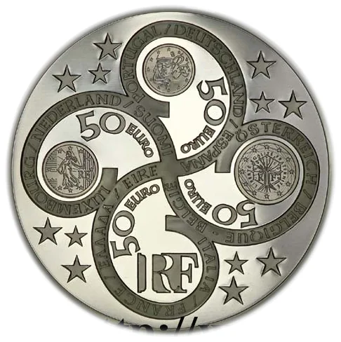 Inspired by Minoan octopus art, this design lists the twelve eurozone countries in curves along the tentacles. The three French euro coin faces and "RF" initials are at the tentacle ends, with the European stars and "50 EURO" value completing a composition of French uniqueness within European diversity.
