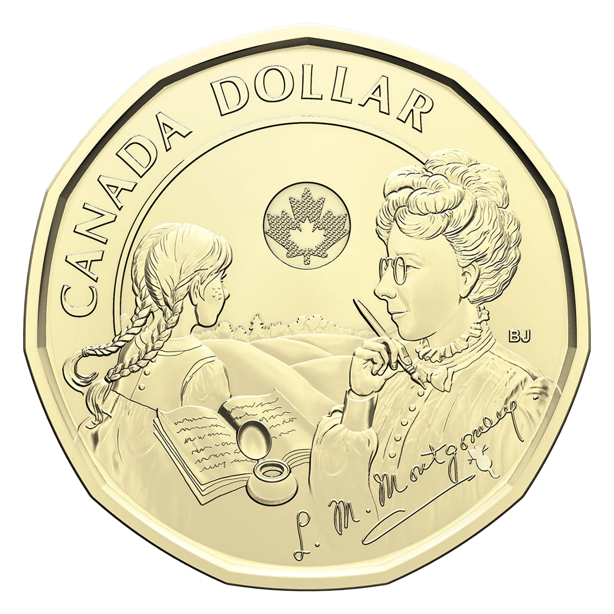 The coin’s reverse depicts author L. M. Montgomery, her signature, and a cat drawing. The design transitions from Montgomery at her writing portfolio to her heroine Anne gazing out at Prince Edward Island, reflecting the author’s imagination and the island’s inspiration.