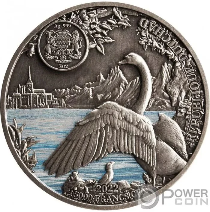 A white swan watches a castle by a colored lake, joined by a bird, a turtle, and a frog on its back.