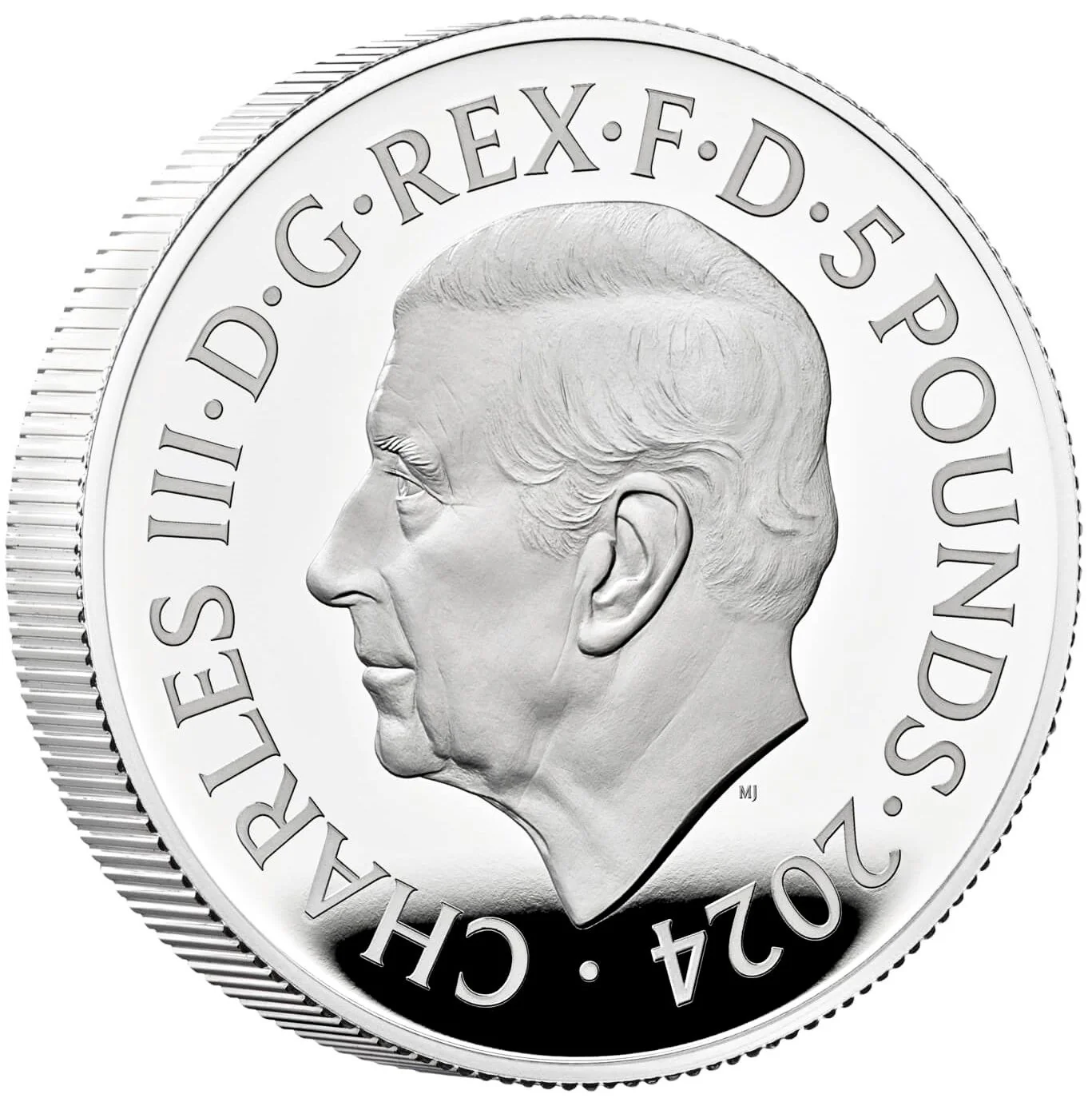 Four allied monarchs in profile: Britain's Prince Regent George, Austria's Francis II, Russia's Alexander I, and Prussia's Frederick William III. The surrounding border features allegorical figures alluding to the peace treaty following their military triumph.