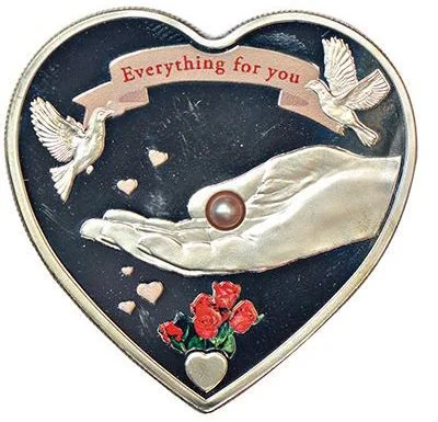 Hand outstretched, holding a pearl, adorned with a ribbon above and flowers below.
