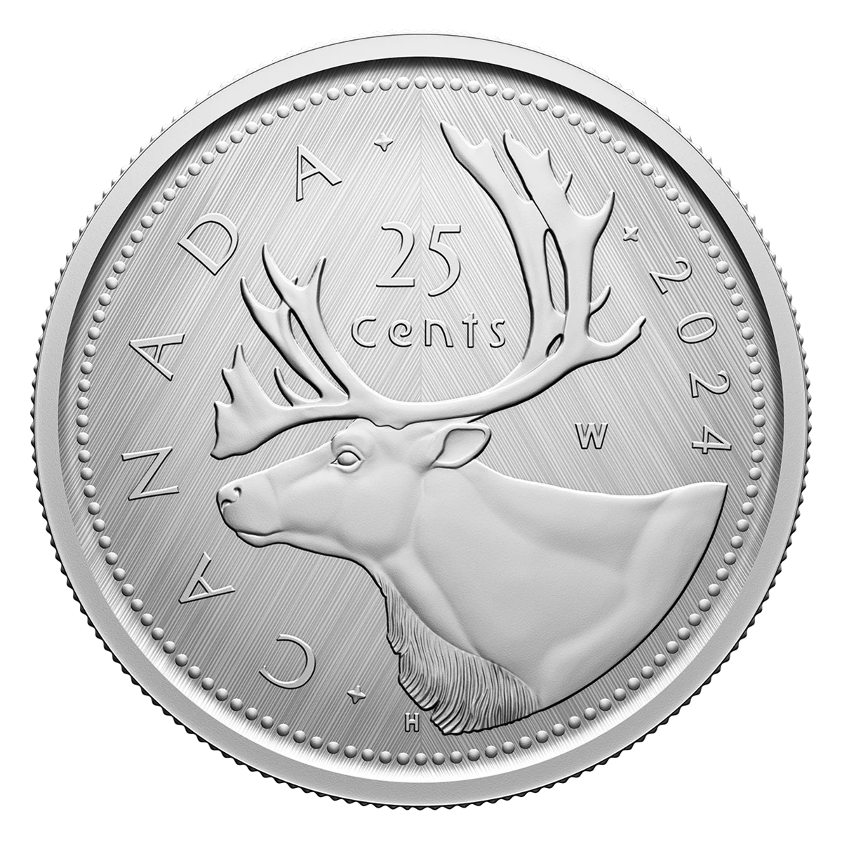A silver tribute to Canada’s 25-cent piece, featuring Emanuel Hahn’s caribou design and the Winnipeg “W” mint mark.