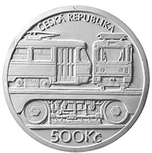 The obverse features a combined side and front view of a ČKD Tatra T3 tram above a section of its underframe. "ČESKÁ REPUBLIKA" arches along the top, while "500 Kč" follows the bottom edge. The Czech Mint mark "ČM" is near the right edge.