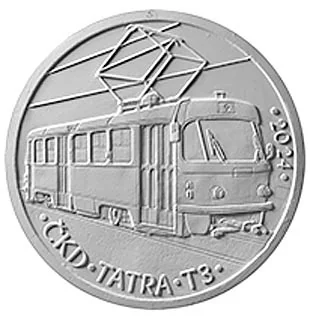 The reverse depicts a ČKD Tatra T3 tram on rails with overhead wires, rendered in a simplified color scheme using yellow and red gold plating. Below is the text "ČKD TATRA T3," while the right edge features "2024" and the designer Zbyněk Fojtů's initials "F" and "Z," all separated by dots.