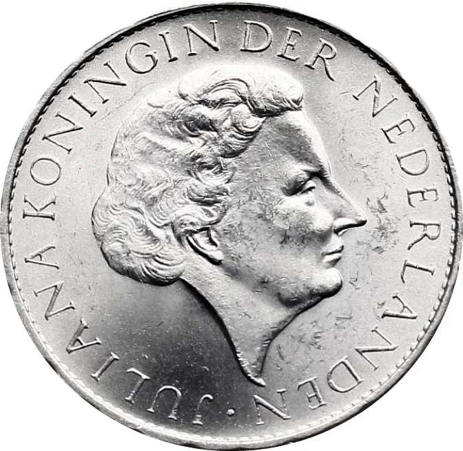Portrait of Queen Juliana facing right, encircled by Dutch text.