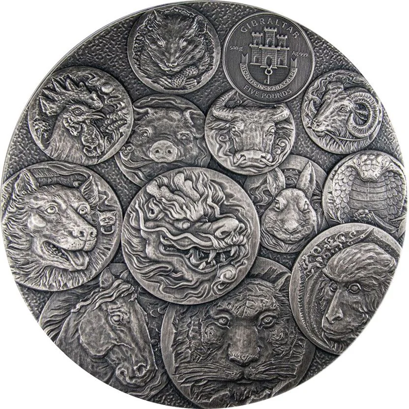 Gibraltar coat of arms above, surrounded by twelve Chinese zodiac signs. Metal, purity, and denomination below.