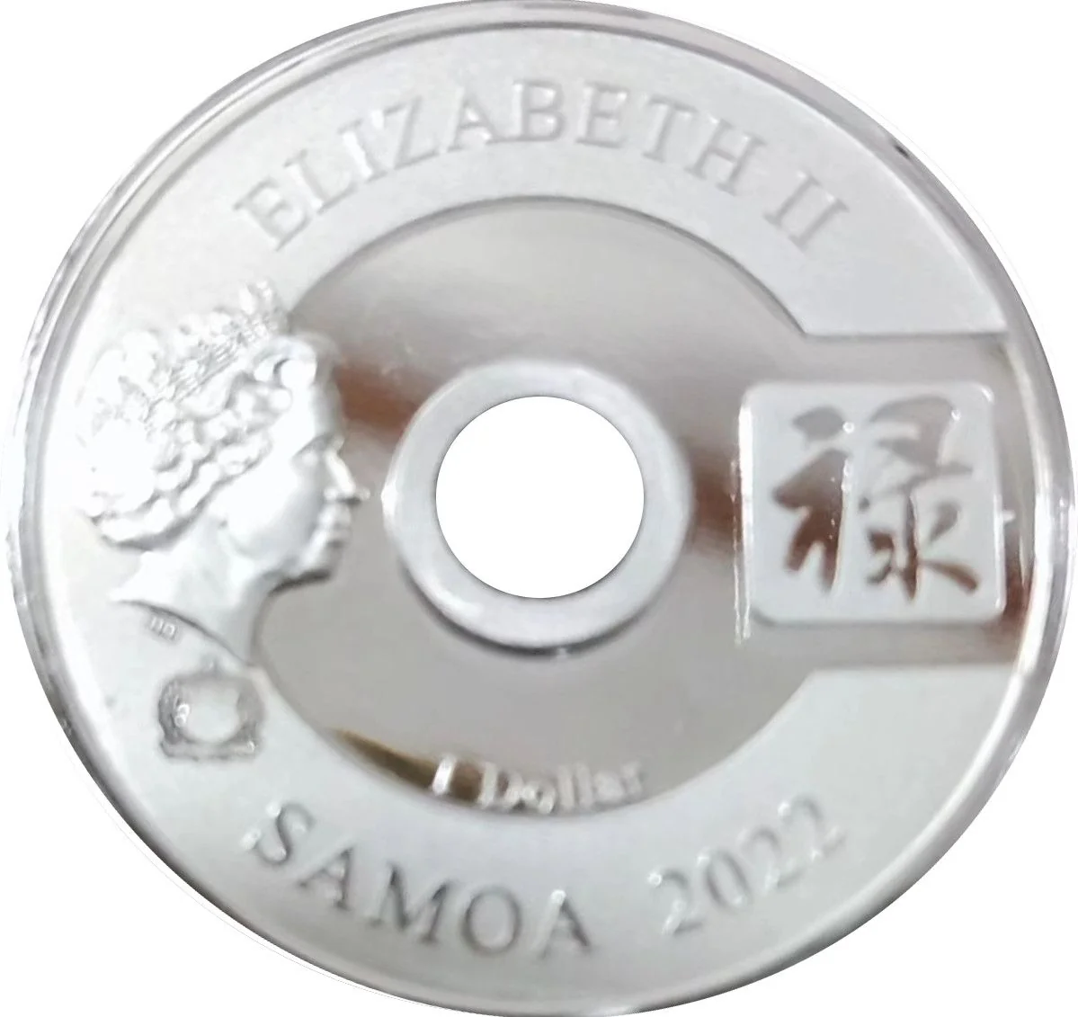 4th Queen Elizabeth II portrait with Samoa's coat of arms left of the hole and the Chinese character "禄" right.