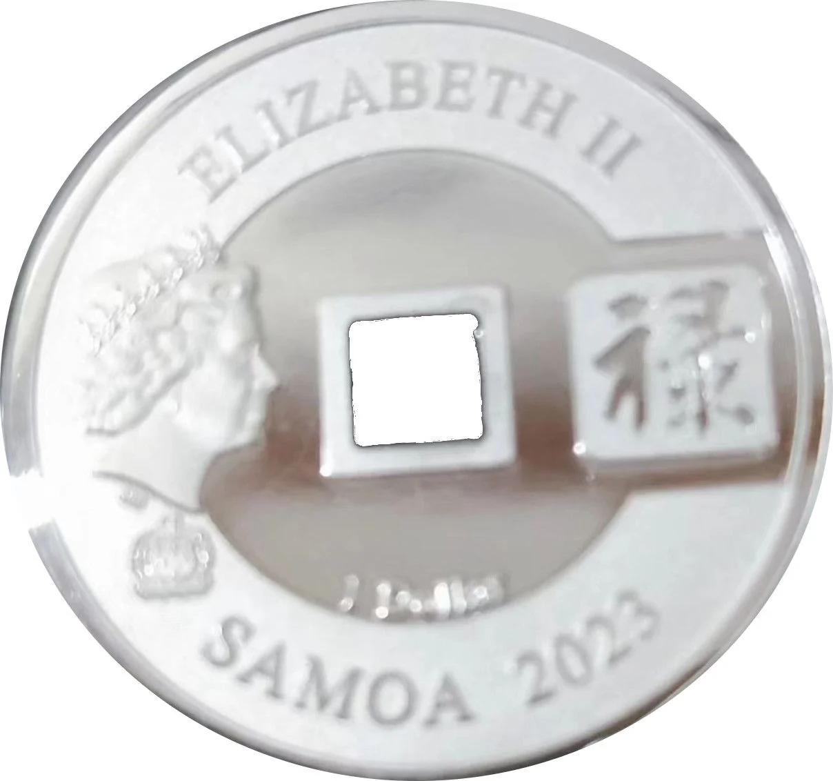 4th Queen Elizabeth II portrait with Samoa's coat of arms left of the hole and Chinese character "禄" right.