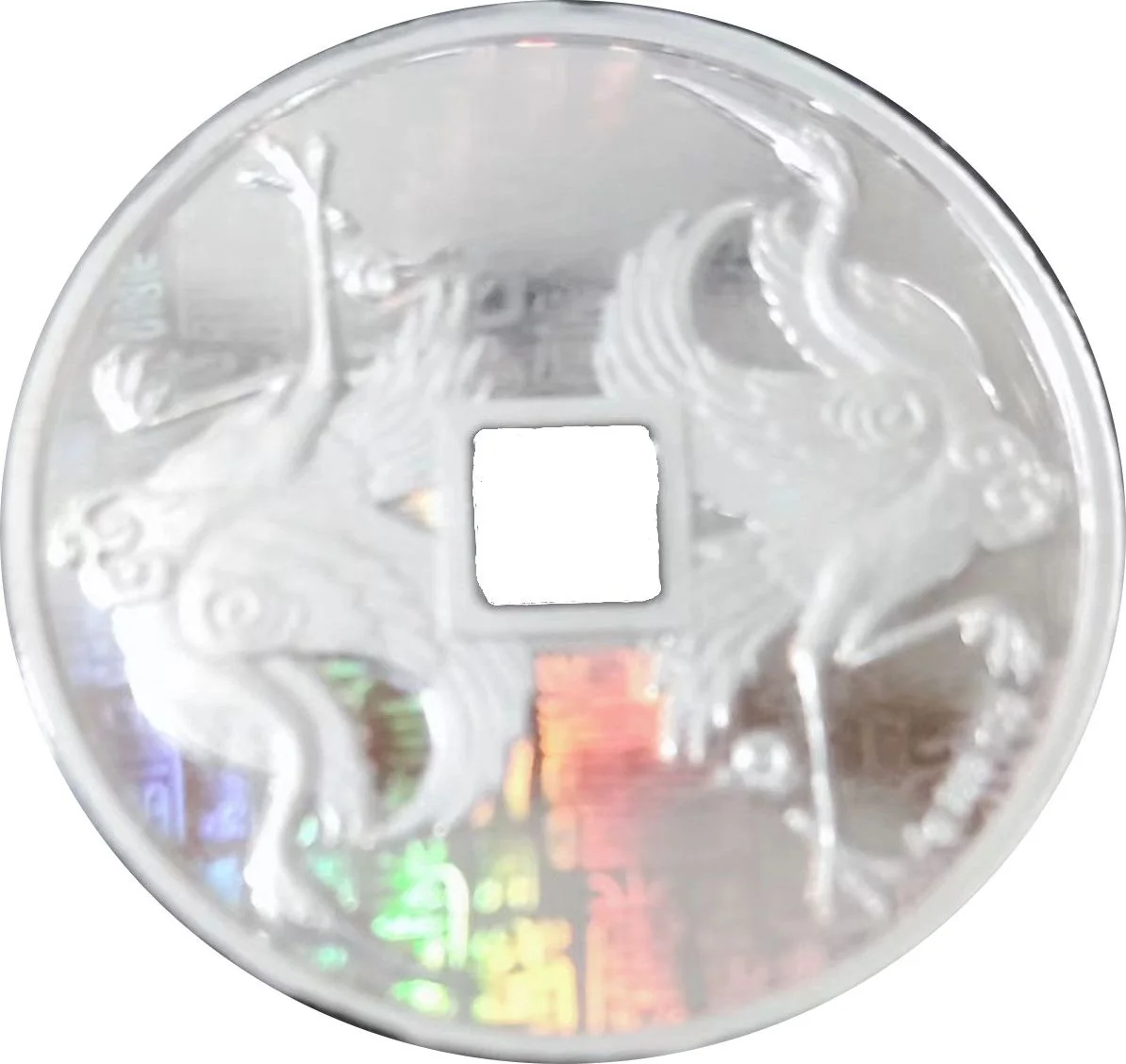 Two red-crowned cranes, symbols of fortune, flank a central square hole above and below a Chinese "夀" character, with multiple script styles in the background.