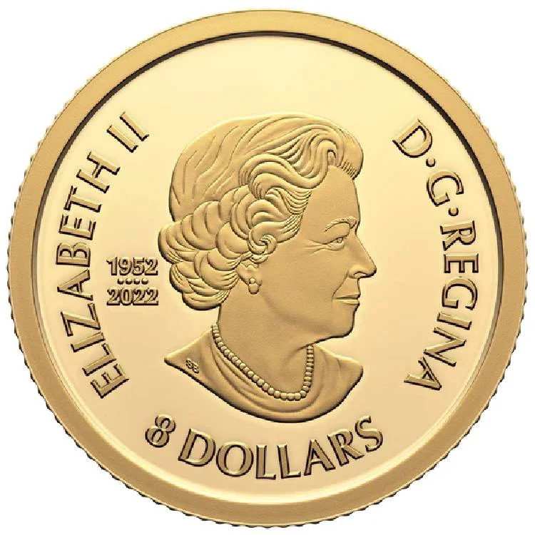 Queen Elizabeth II at 77, facing right, wearing a necklace and earrings. The effigy includes the dates 1952–2022 separated by four pearls, representing her four portraits on Canadian coins.