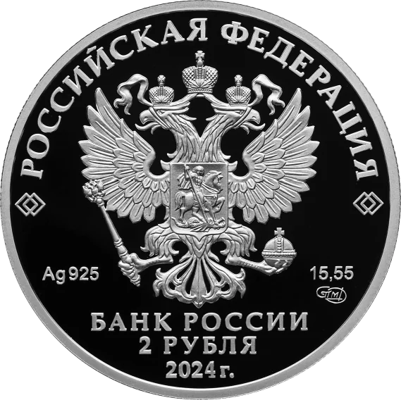 The obverse features the Russian Federation coat of arms with "РОССИЙСКАЯ ФЕДЕРАЦИЯ" above, flanked by diamonds. Below are the metal details and mint mark. The bottom center reads "БАНК РОССИИ", "2 РУБЛЯ", and "2024 г.".