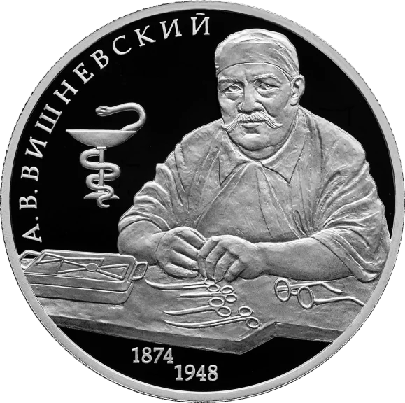 The reverse features a relief portrait of Alexander Vishnevsky at a surgical table with the Bowl of Hygieia, encircled by the inscription "А. В. ВИШНЕВСКИЙ" and his life dates "1874" and "1948" below.
