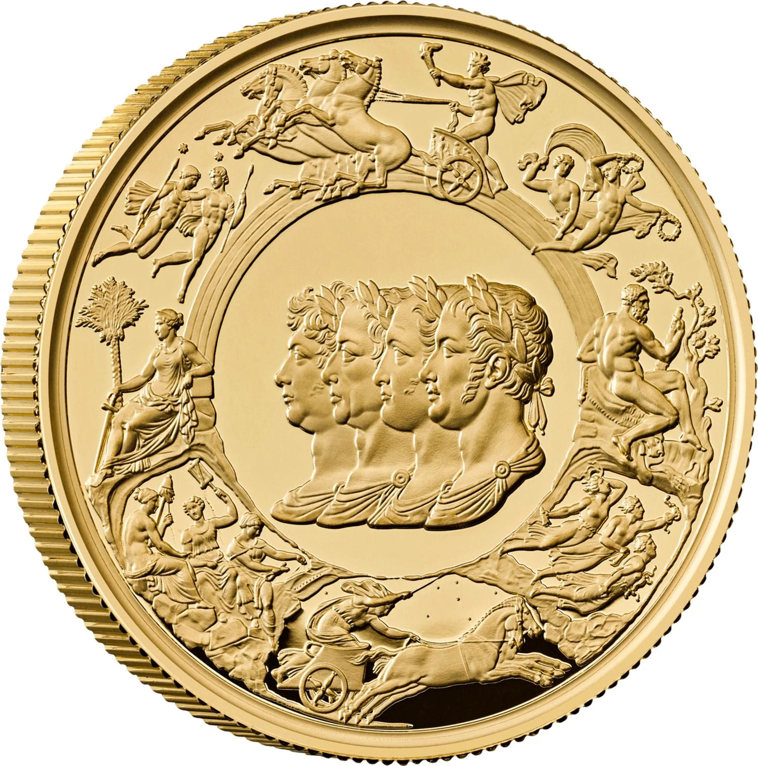 Four allied monarchs in profile: Britain's Prince Regent George, Austria's Francis II, Russia's Alexander I, and Prussia's Frederick William III. The surrounding border features allegorical figures alluding to the peace treaty following their military triumph.