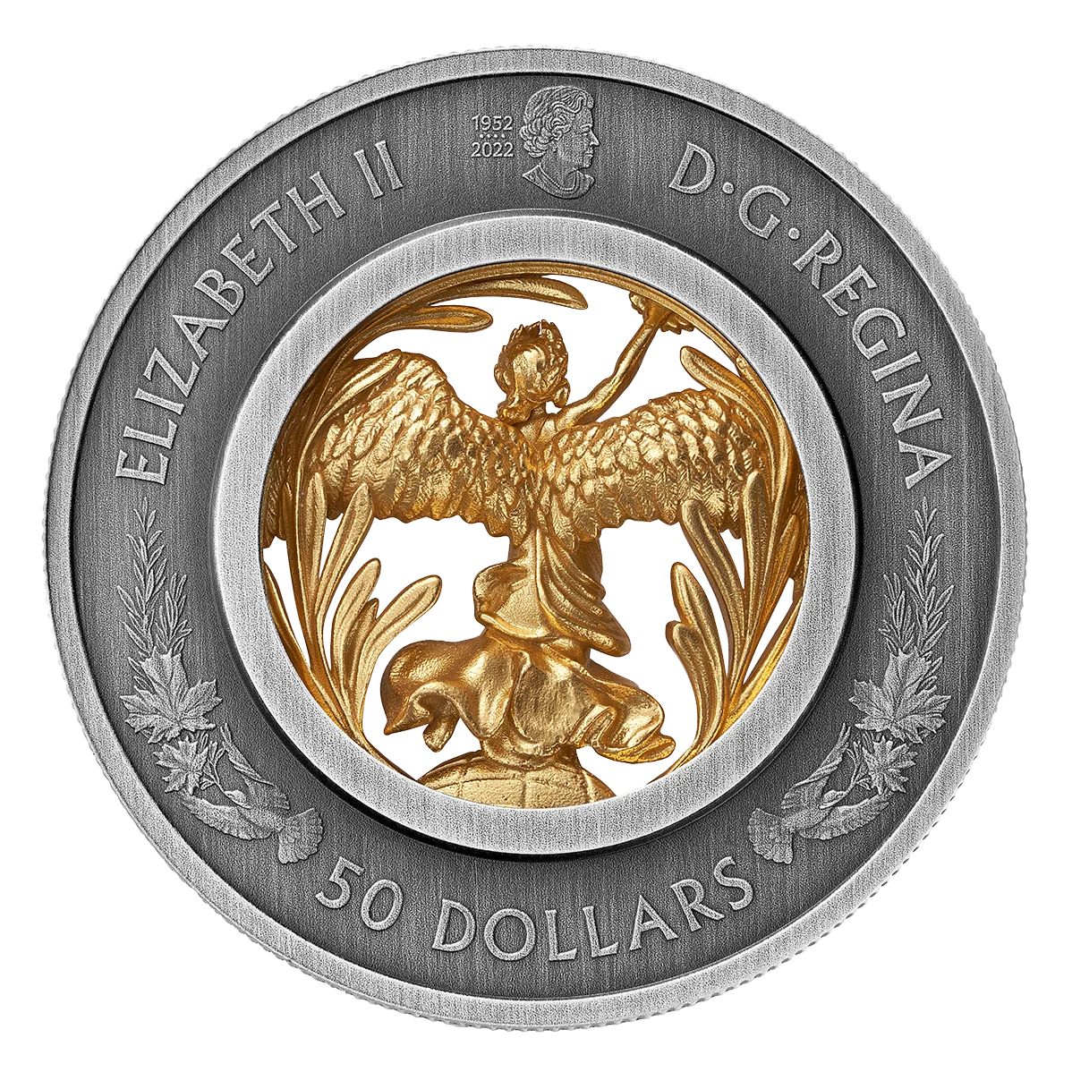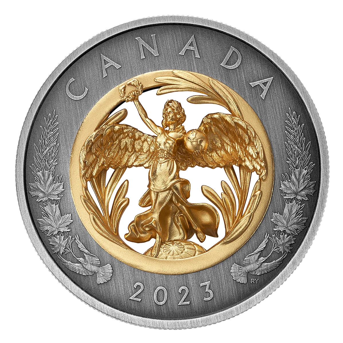 This coin features a gold-plated 3D silver figure of Freedom, inspired by Ottawa's National War Memorial. She rides a mythical bird, holding a torch aloft, set within an antiqued silver rim. The outer rim displays a scroll with olive branches and maple leaves, honoring Canada's role in peace and freedom.