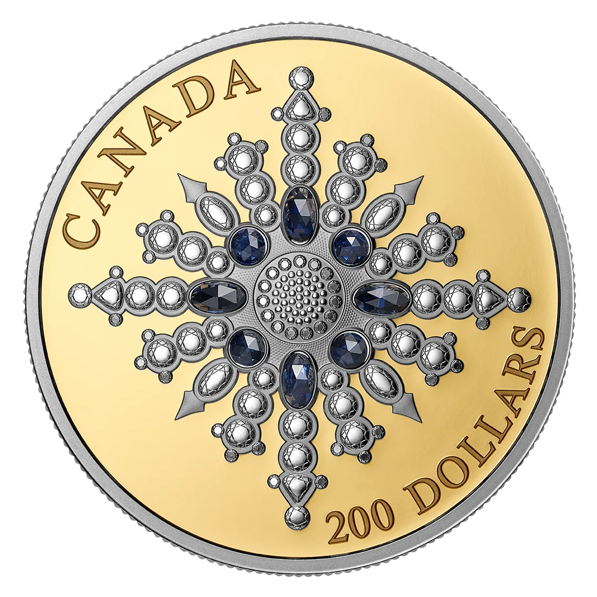 The reverse side depicts the Sapphire Jubilee Snowflake Brooch, a 2017 Canadian gift for the Queen's 65th reign year. The platinum-plated engraved snowflake features eight blue sapphires (four round, four oval) encircling its centre.