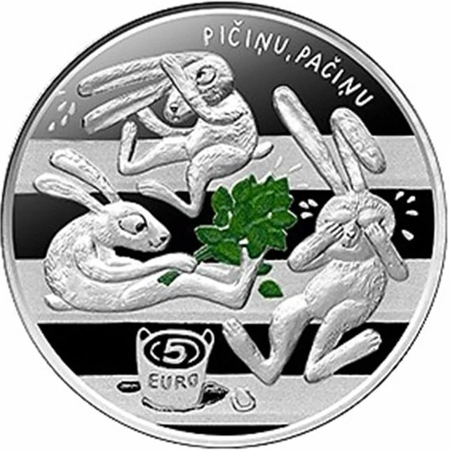 The coin's obverse shows a scene from Vilis Plūdons's "The Bunny Bathhouse": one bunny washes its ears, another uses a sauna whisk, and a third washes its eyes. A foreground bucket has a water swirl forming "5", with "EURO" on its side. The inscription arcs at the top right.