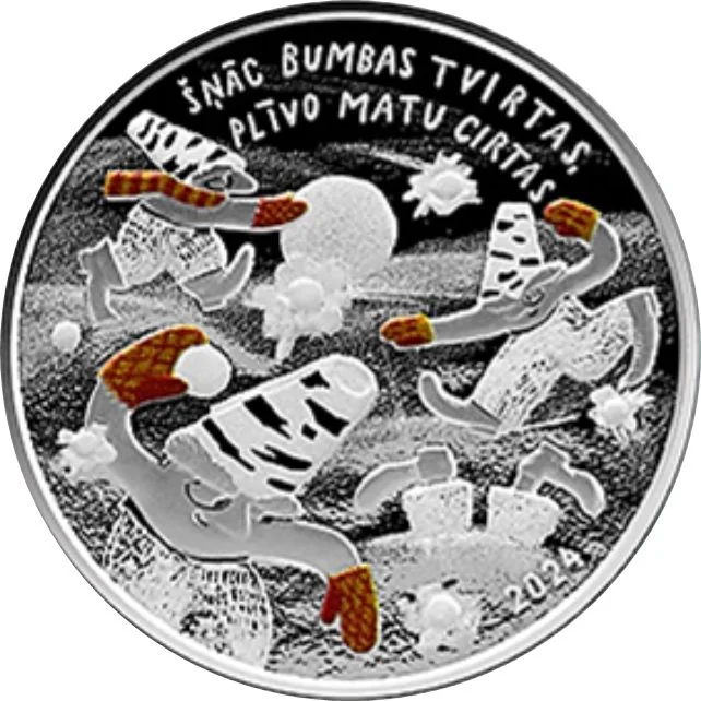 The reverse depicts a scene from Vilis Plūdons's poem: two dwarves in a snowball fight, one rolling a snowball while only the booted legs of another, stuck in a snowdrift, are visible. The year "2024" is inscribed in a semicircle at bottom right.