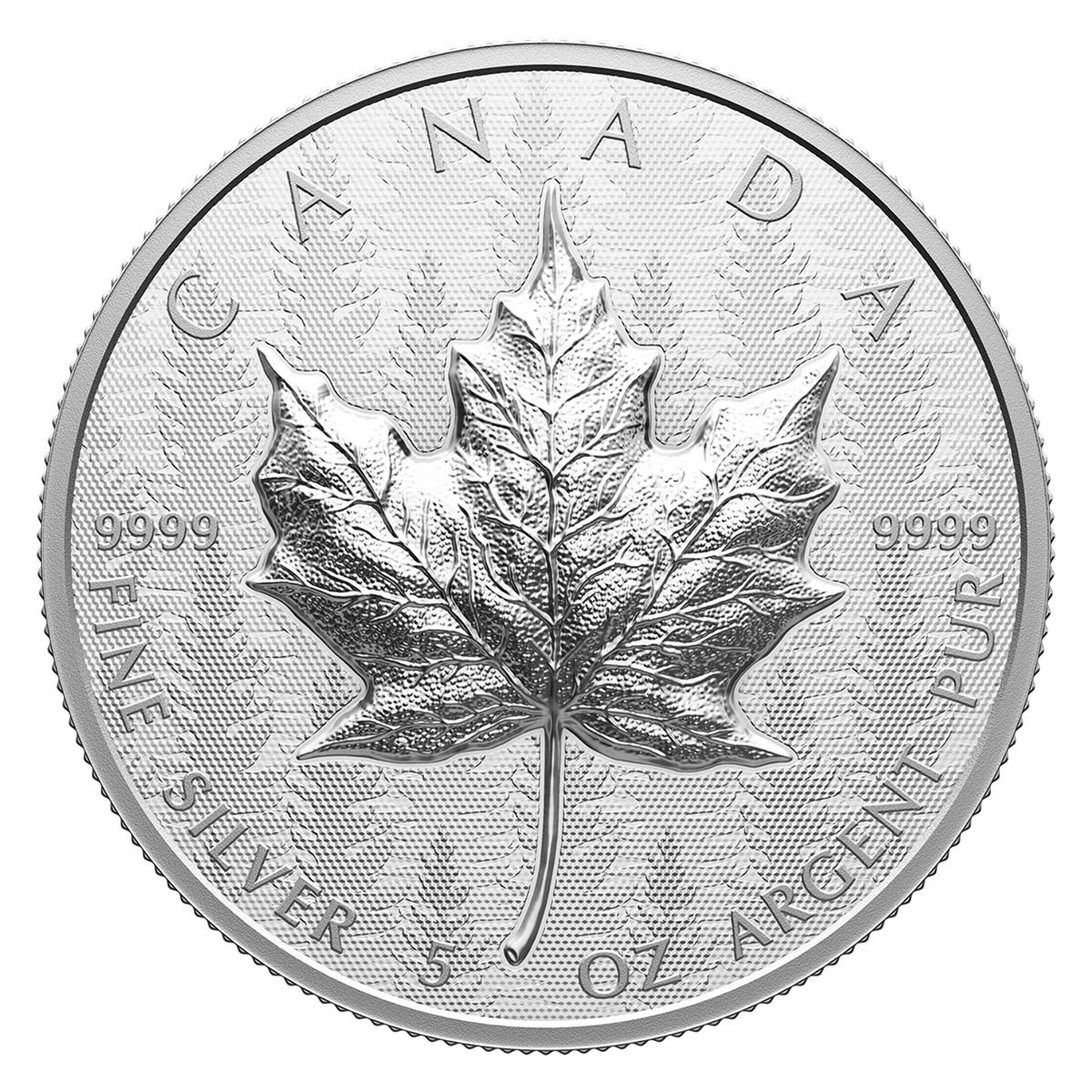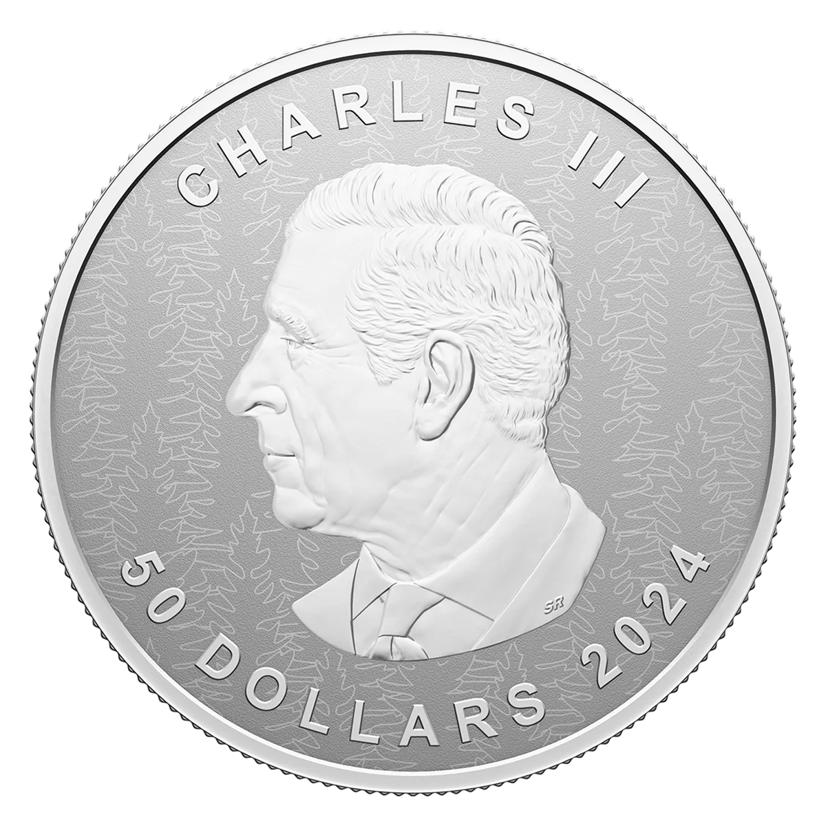 Your coin's reverse features an ultra-high relief Silver Maple Leaf. The raised maple leaf is set against a "heart of the forest" pattern; tilting the coin creates a light play that gives the illusion of a misty, endless forest.