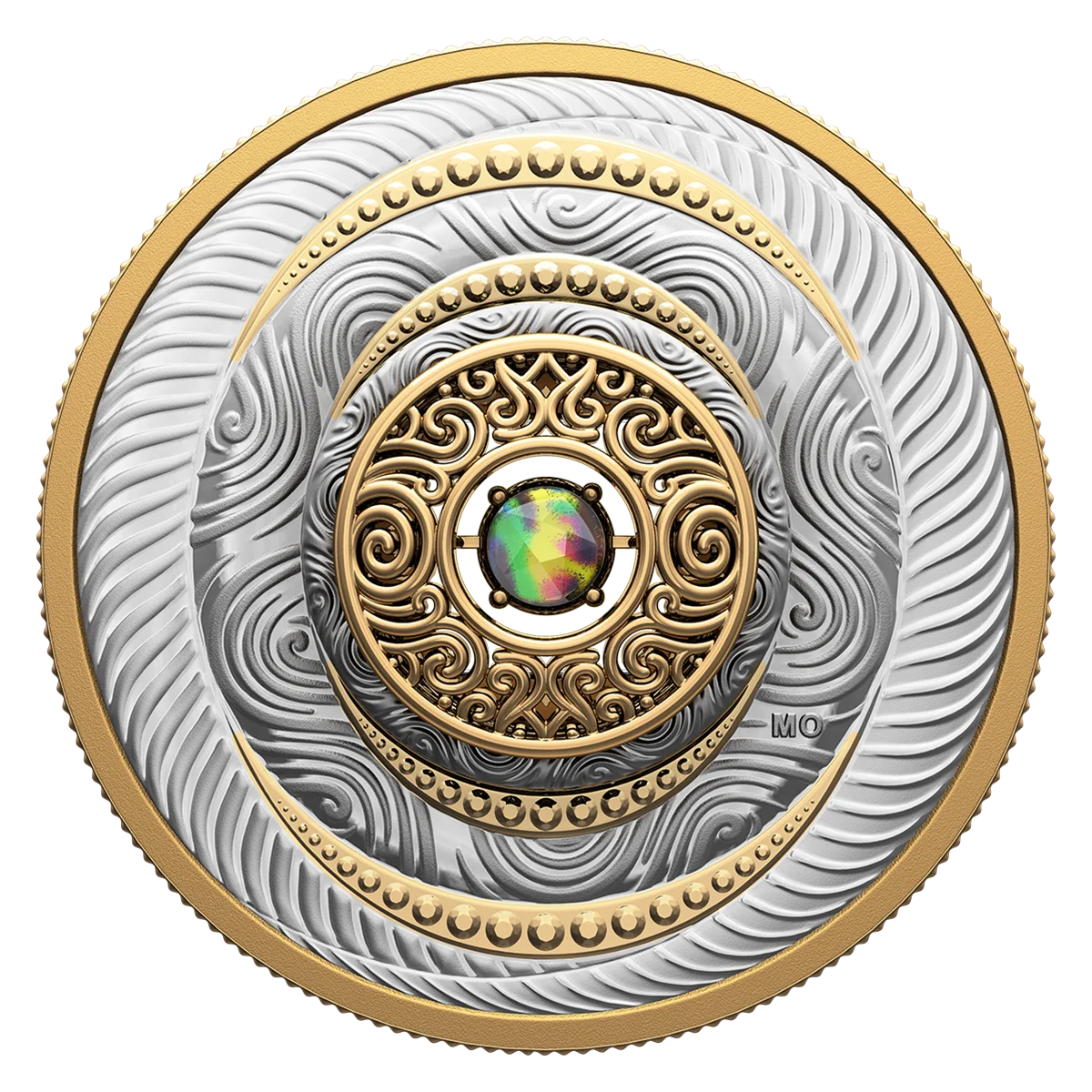 With selective gold plating, the reverse depicts swirling line art that evokes a shifting wind. This motion encircles the center, where a multicolored ammolite gemstone is set to "dance" with the slightest movement.