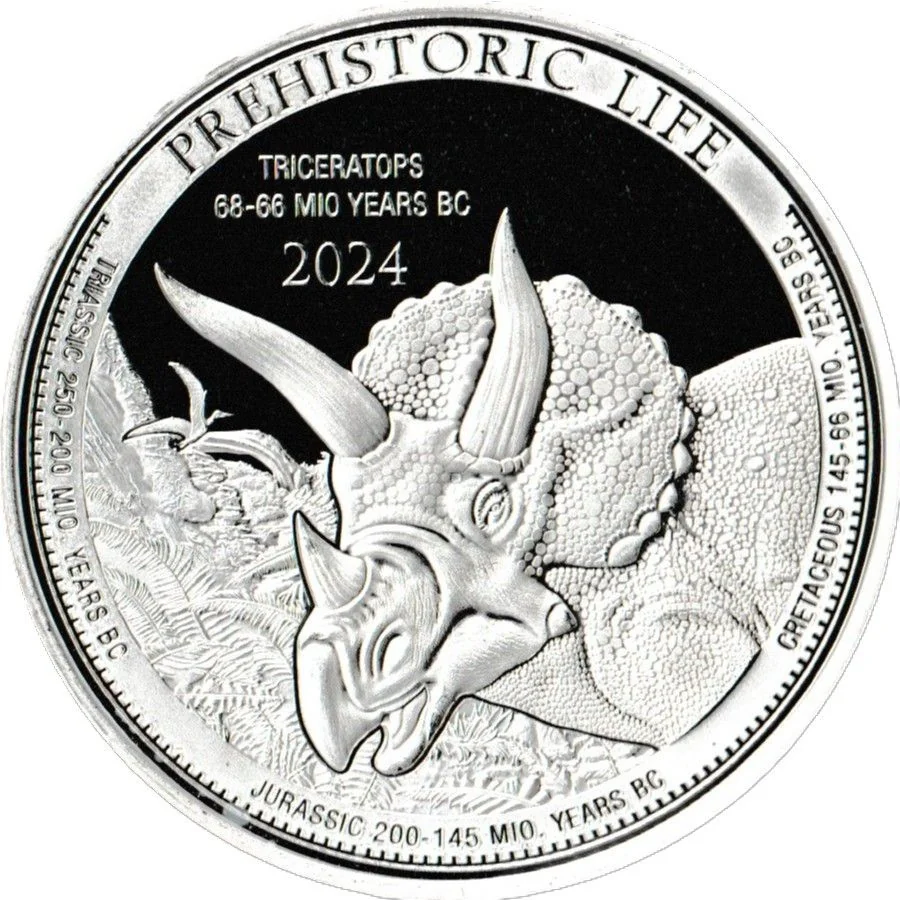 Description: The reverse depicts a Triceratops, a horned herbivore from the late Cretaceous (68-66 million years ago). Inscriptions include "PREHISTORIC LIFE," "TRICERATOPS 68-66 MIO YEARS BC," and the year "2024."