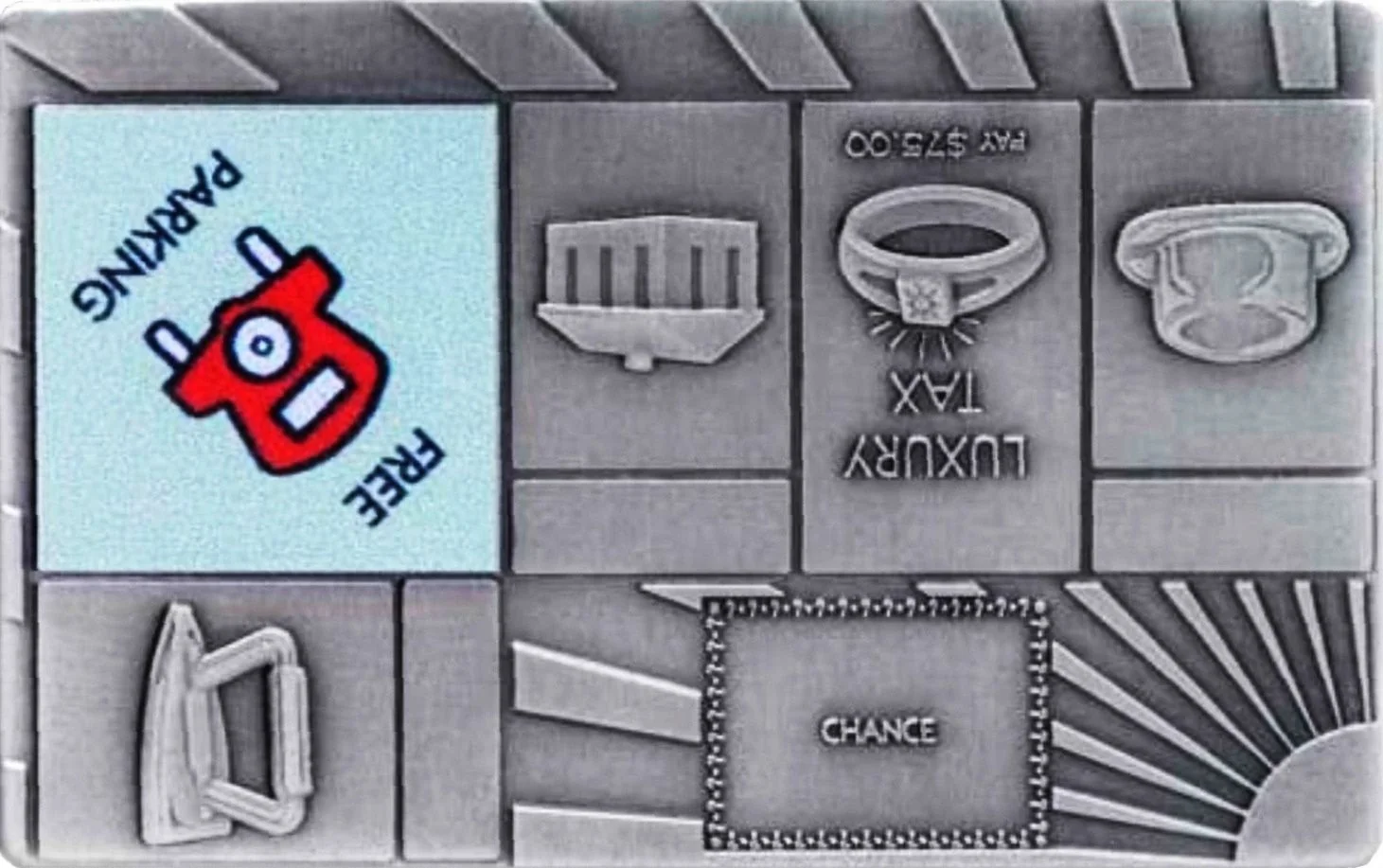Monopoly board's upper left corner, showing "Free Parking" and adjacent spaces.