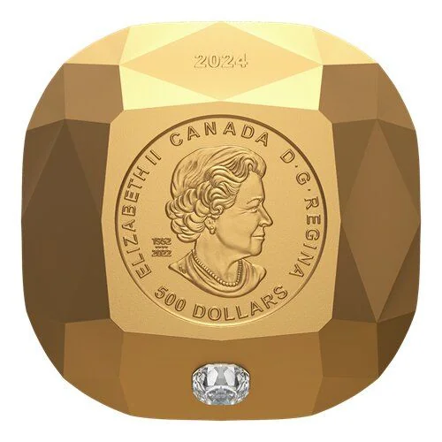 Description: This coin features a patented diamond-cut design from Crossworks Manufacturing, mirroring De Beers Ideal Cuts. It is set with a 0.23 carat De Beers Ideal Cushion Cut Diamond, sourced from a premier Canadian mine, on one facet. The "2024" year is engraved on another. The primary face displays "CANADA," "500 DOLLARS," and a right-facing portrait of a 77-year-old Queen Elizabeth II, bare-headed with jewelry. This effigy includes the dual dates "1952" and "2022," separated by four pearls representing her four Canadian coin portraits.