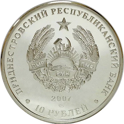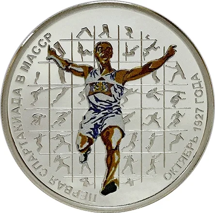 Description: A running athlete and a colored coin at the centre. Around the edge, the inscription reads: "ПЕРВАЯ СПАРТАКИАДА В МАССР" (FIRST SPARTAKIADA OF THE MOLDAVIAN SSR) on the left, and "ОКТЯБРЬ,1927" (OCTOBER, 1927) on the lower right.