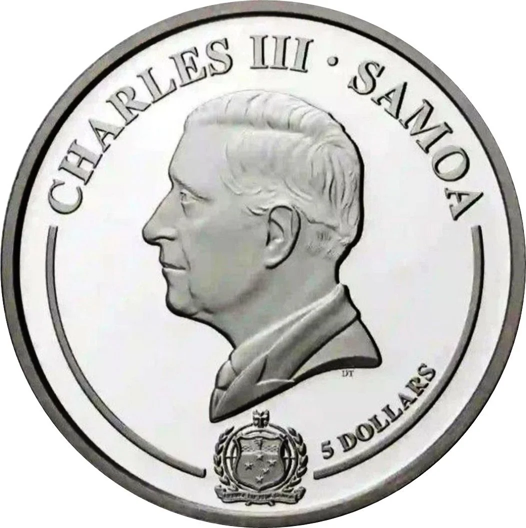 King Charles III left, with Samoa's coat of arms and denomination below.