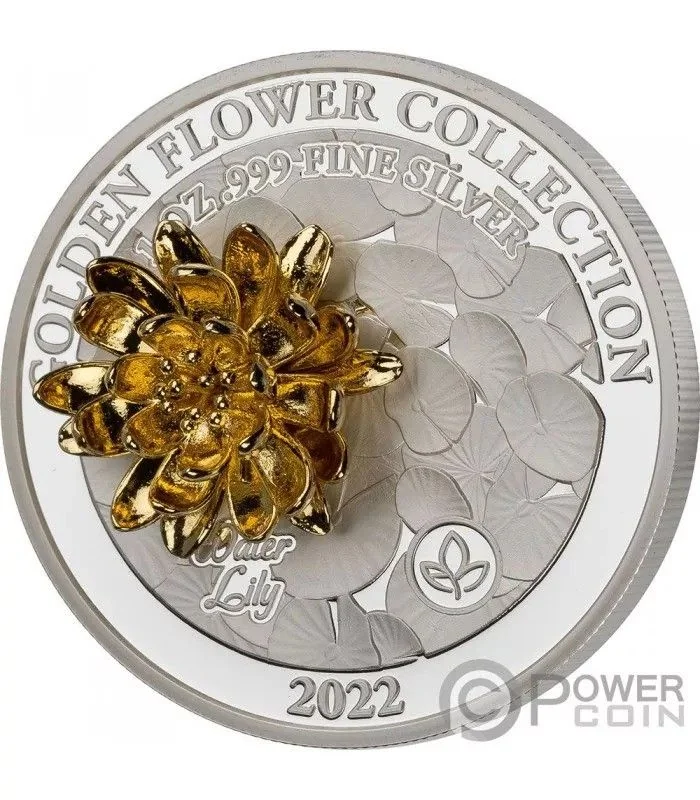 Description: The reverse features a 3D gilded water lily with frosted leaves, surrounded by the inscriptions: "GOLDEN FLOWER COLLECTION," "Water Lily," "2022," and "1OZ 999 FINE SILVER."