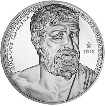 This detailed portrait of Pindar is inspired by contemporary busts. It is flanked by a Greek-key design, with the text "PINDAR 522 – 443 B.C.", the year "2018", and the Hellenic mintmark to its right.
