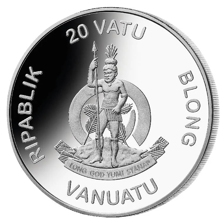 Vanuatu's arms show a Melanesian warrior before a curved boar's tooth, a scroll reading "LONG GOD YUMI STANAP", and the value above.