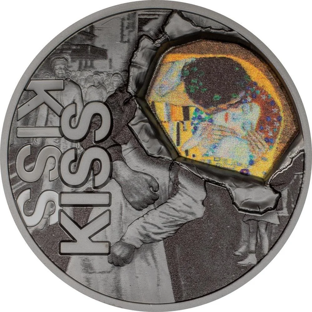 A fusion of Alfred Eisenstaedt's "V-J Day in Times Square" and Gustav Klimt's "The Kiss."