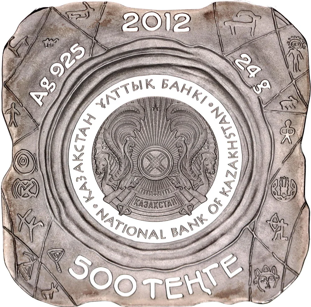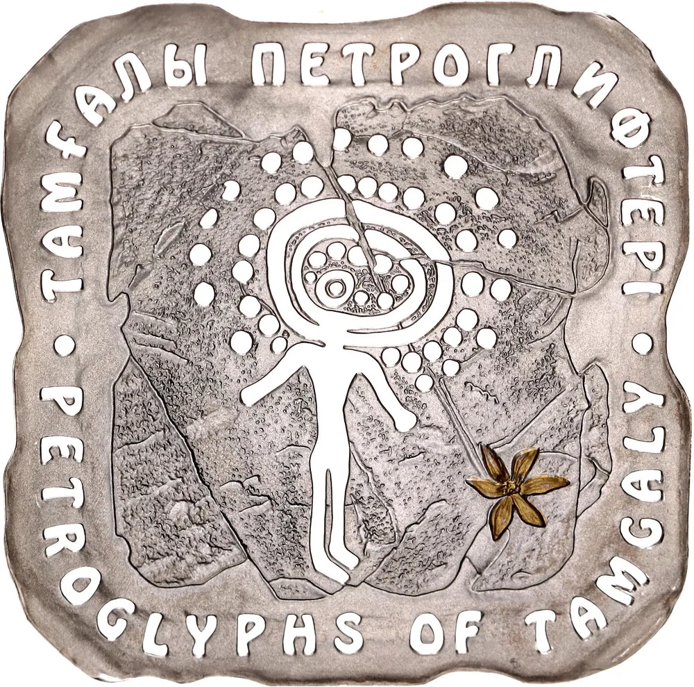 Description: Coat of arms over stylized Tamgaly petroglyphs and stone.