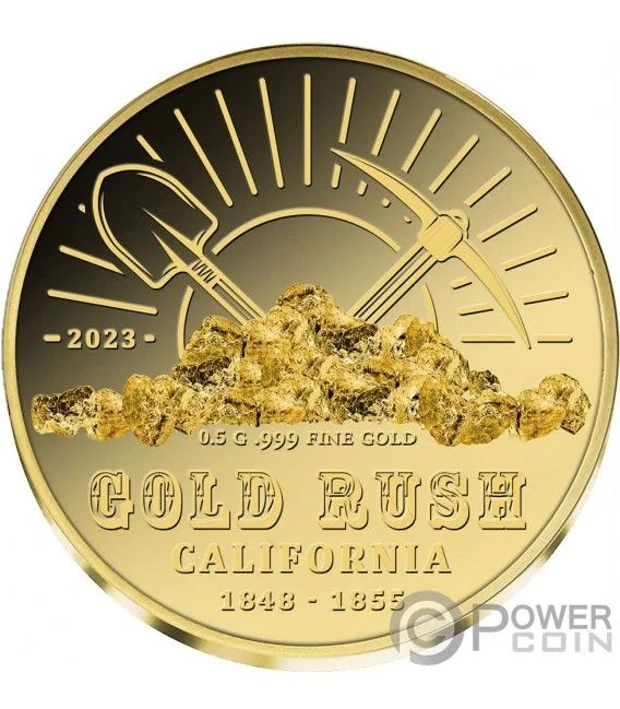 The reverse depicts a shovel and pickaxe behind the gold, with a sun highlighting its splendor, along with the inscription "0.5 g .999 FINE GOLD."