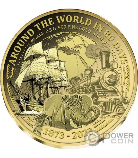 The reverse depicts the story's main vehicles, surrounded by the inscriptions: "AROUND THE WORLD IN 80 DAYS," "0.5g FINE GOLD," and the coin's name.